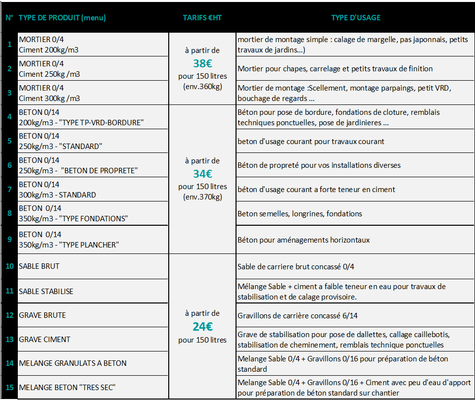 Que vous recherchiez du béton prêt à l’emploi, du mortier, du sable ou du gravier, nous proposons une gamme complète de produits à des prix compétitifs et des quantités ajustées à vos projets.